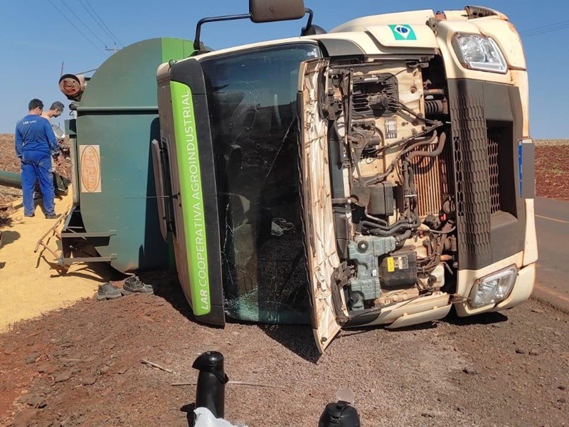 Na madrugada desta terça-feira (30), um caminhão de transporte de ração tombou na rodovia PR-488, no trecho entre Santa Helena e Diamante D’Oeste.