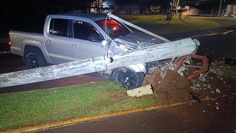 Nesse momento, o condutor perdeu o controle da direção e atingiu um poste de iluminação pública localizado no canteiro central, derrubando a estrutura.