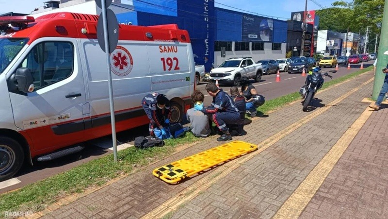 Com o impacto, a moto avançou sobre a calçada e derrubou uma estrutura de ferro usada para depósito de lixo. O condutor da motocicleta foi socorrido por uma equipe do Corpo de Bombeiros com ferimentos moderados e encaminhado à UPA para atendimento médico.