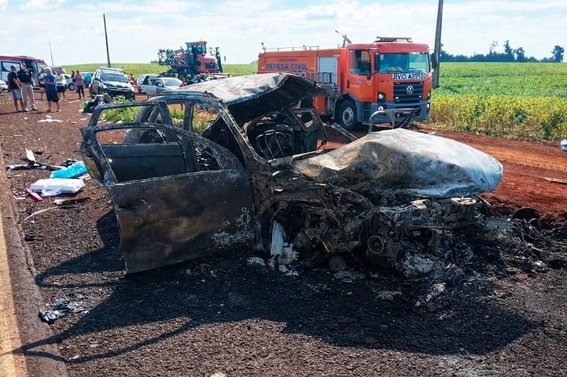 Após o impacto, o veículo de passeio pegou fogo e o motorista morreu no local.