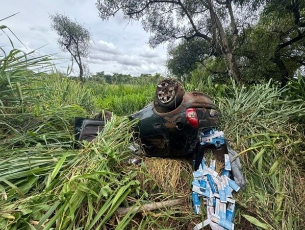 A fuga só teve fim na região do Bairro Santa Clara, quando o condutor perdeu o controle do veículo, que capotou em uma área de vegetação. Após o acidente, os policiais constataram que o automóvel estava carregado com cigarros.
