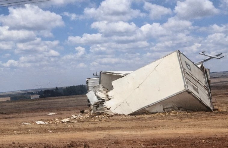 Com a força do impacto, o caminhão branco saiu da pista, adentrou uma área de plantação e acabou colidindo contra um poste . O outro caminhão envolvido no acidente também saiu da rodovia e parou em meio à lavoura.