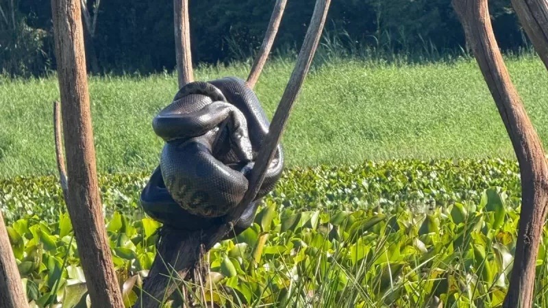 A cena, que dificilmente é vista, mostra a cobra praticamente imóvel, apoiada sobre o tronco de uma árvore e cercada por aguapés.