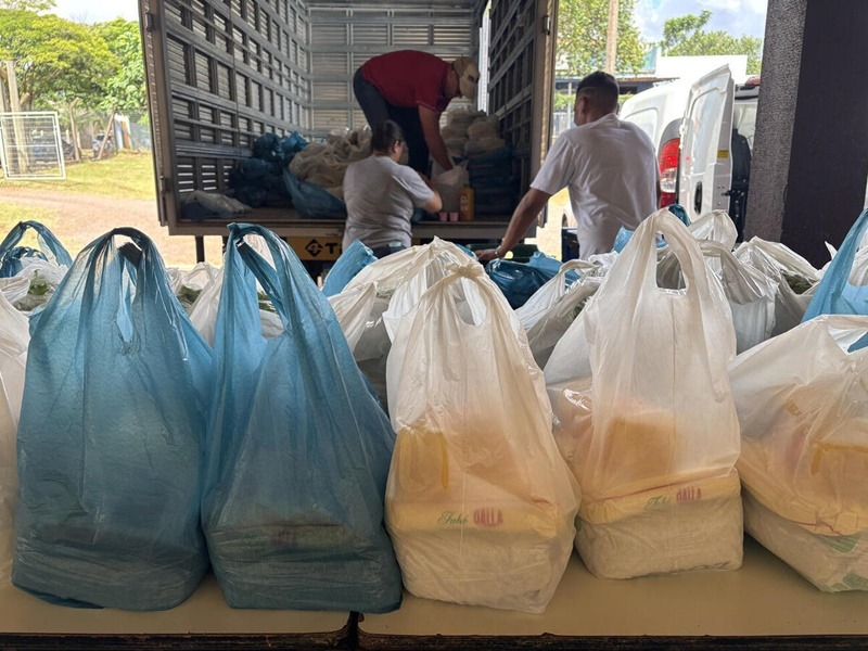 Os alimentos são adquiridos da agricultura familiar local por meio do PAA e complementados com doações de empresas, com organização do Banco de Alimentos do município.