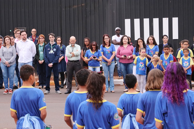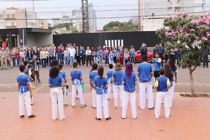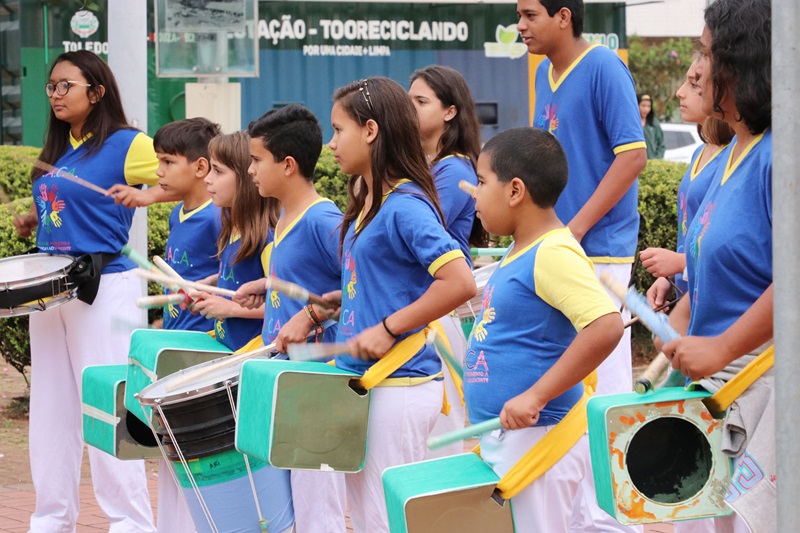 Nesta quinta-feira (09), o grupo Recicla Som apresentou uma fanfarra durante a sessão cívica em frente à Prefeitura. Foram 18 crianças e adolescentes participantes do Núcleo de Atendimento à Criança e ao Adolescente (NACA) que fizeram um show com instrumentos musicais feitos de materiais recicláveis.