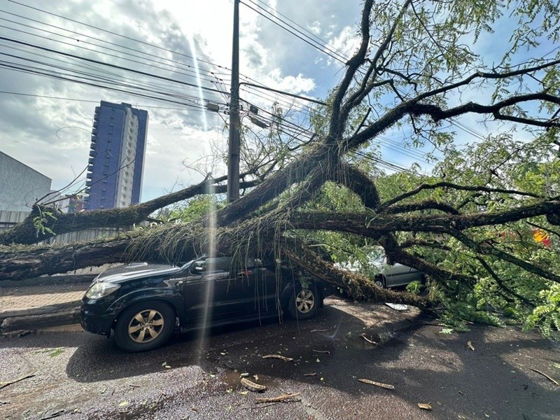 Na Avenida Costa e Silva, no cruzamento com a Avenida Paraná, uma árvore de grande porte caiu no meio da pista e precisou ser retirada pelo Corpo de Bombeiros. Na Avenida Paraná, uma árvore de menor porte atingiu um carro. O veículo teve danos leves e ninguém ficou ferido. Veja no vídeo acima.