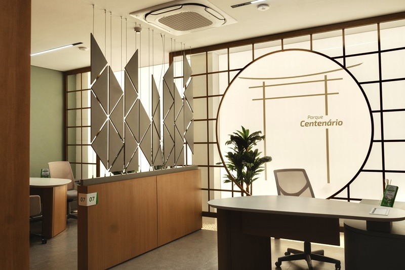 As estações de trabalho têm um toque especial com acabamentos que lembram o “origami” e simbolizam a habilidade da Cooperativa de se aproximar de verdade das pessoas.