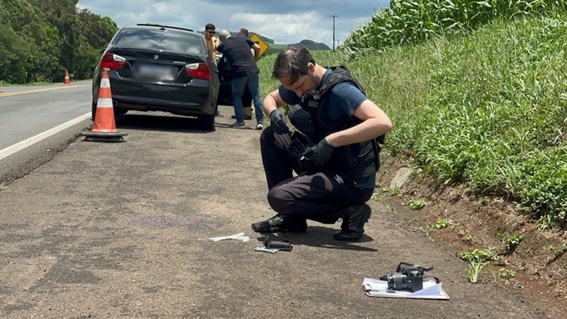A Polícia Científica realizou perícia na manhã desta segunda-feira (24) na rodovia PR-483, em Francisco Beltrão, onde o músico Everton André Zanata, de 50 anos, foi baleado após um desentendimento de trânsito. O crime envolveu o condutor de uma caminhonete GM S10, com placas de Londrina (PR), e ocorreu em meio a uma disputa por ultrapassagens.