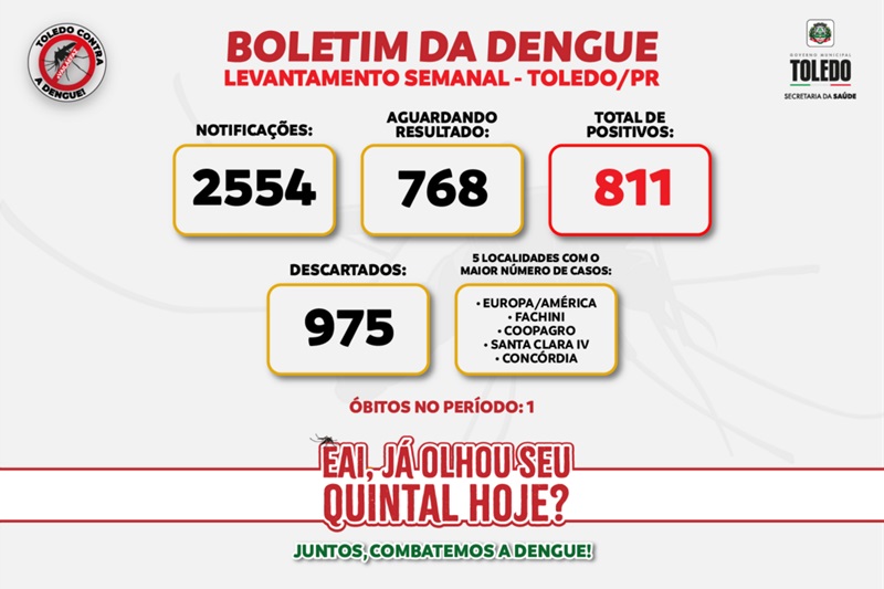Apesar dos esforços da administração municipal e entidades parceiras, a dengue em Toledo continua avançando. O boletim epidemiológico divulgado nesta sexta-feira (23) aponta um crescimento de 34,94%, saltando dos 601 da semana passada para 811, com 768 notificações ainda aguardando resultado. A região com maior incidência são os Jardins Europa e América concentrando 42,17% dos casos, totalizando 342 confirmações.