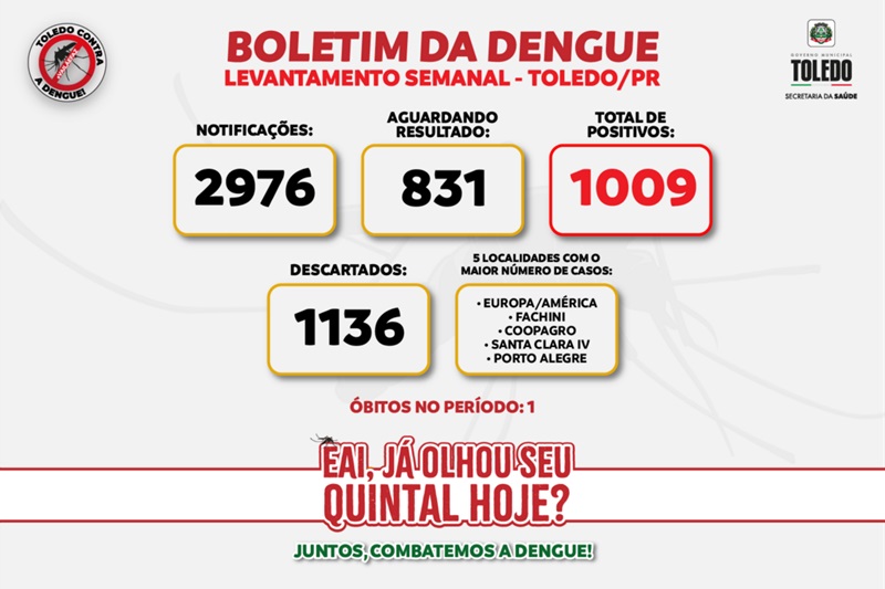 A Secretaria de Saúde de Toledo (SMS) divulgou, na tarde desta sexta-feira (9), o boletim epidemiológico da dengue. Até às 10h, o município registrou 1.009 casos da doença, 24,41% a mais que na semana passada (811, em 23 de fevereiro) – número que pode crescer significativamente, pois há 831 pessoas com sintomas da doença aguardando resultado do exame.