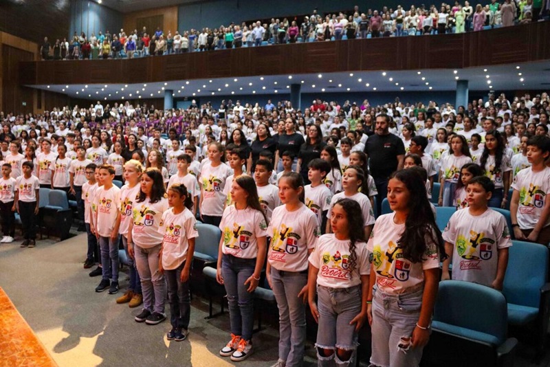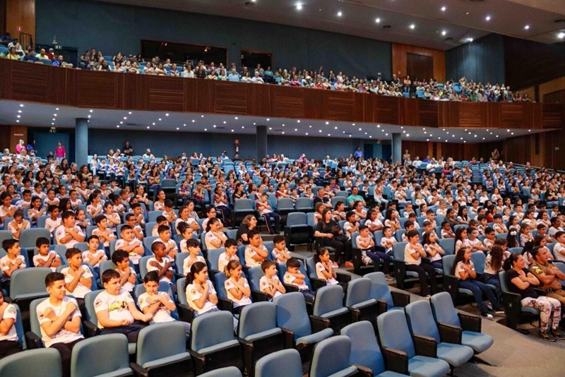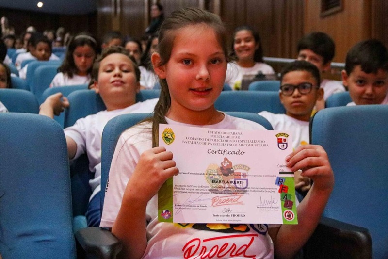 Com uma energia ímpar das crianças que lotaram o Teatro Municipal de Toledo, foi realizada, nesta quarta-feira (29), a formatura de mais uma turma do Programa Educacional de Resistência às Drogas e à Violência (PROERD). Mais de 600 estudantes dos quintos anos da rede pública municipal e de escolas privadas participaram do momento. Ao todo, foram necessárias três cerimônias para atender os aproximadamente 2.040 alunos e alunas envolvidos com a atividade em 2023.