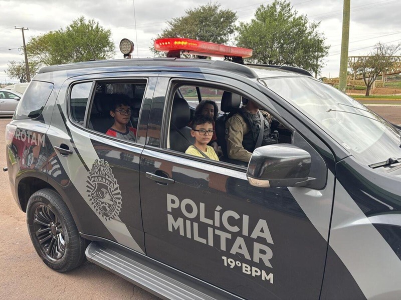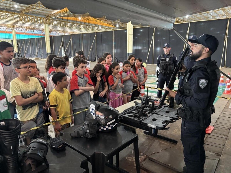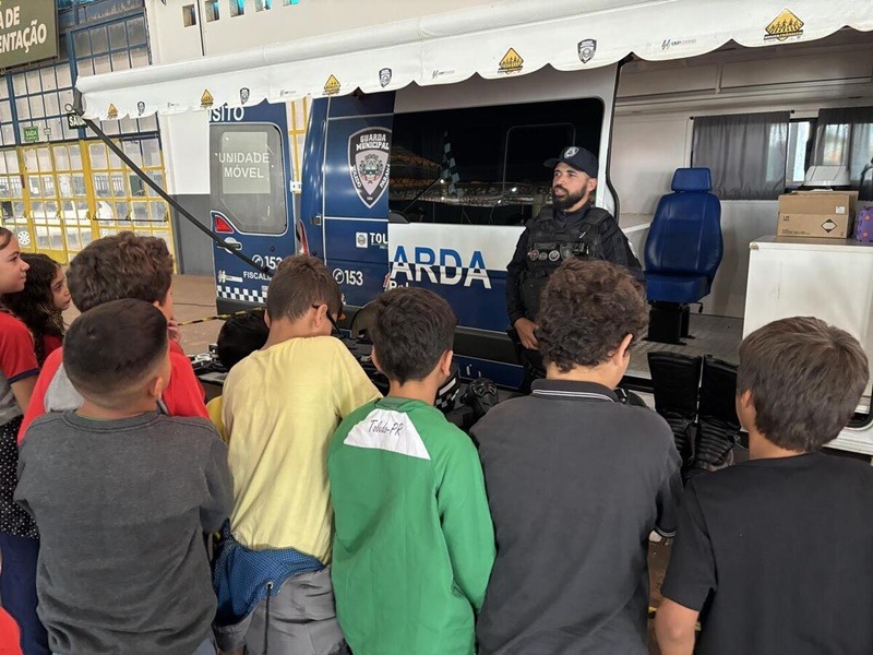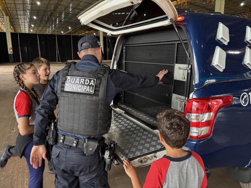 A turma do 5º B da Escola Municipal Anita Garibaldi participou, nesta quinta-feira (9), de uma ação conjunta entre a Guarda Municipal (vinculada à Secretaria de Segurança e Trânsito) e o 19º Batalhão de Polícia Militar (BPM), sediado em Toledo, no Centro de Eventos Ismael Sperafico. A atividade, alusiva ao Mês das Crianças, incluiu apresentações de equipamentos de uso policial, armamentos, munições, escudos, sprays de pimenta e de gengibre, além dos cães e viaturas das corporações.