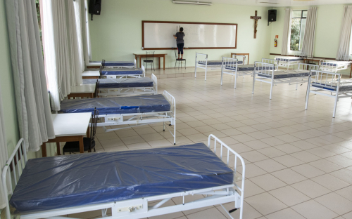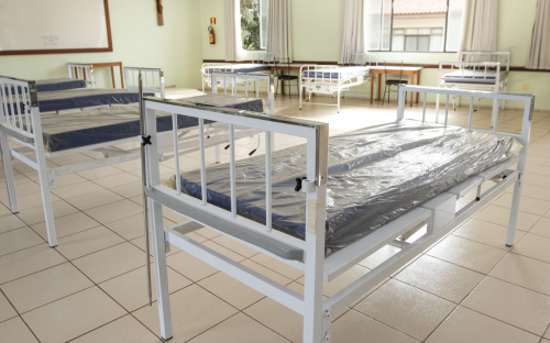 No auditório do Instituto ficarão os leitos coletivos. Todos com espaçamento maior que o recomendado pela Vigilância Sanitária. As camas hospitalares utilizadas foram doadas pela empresa Prati Donaduzzi.