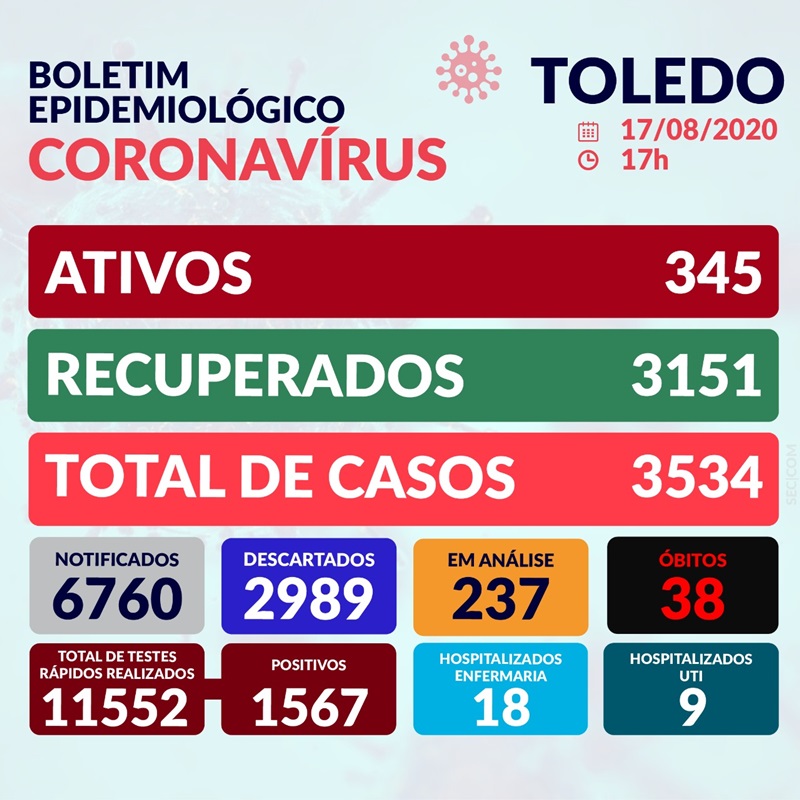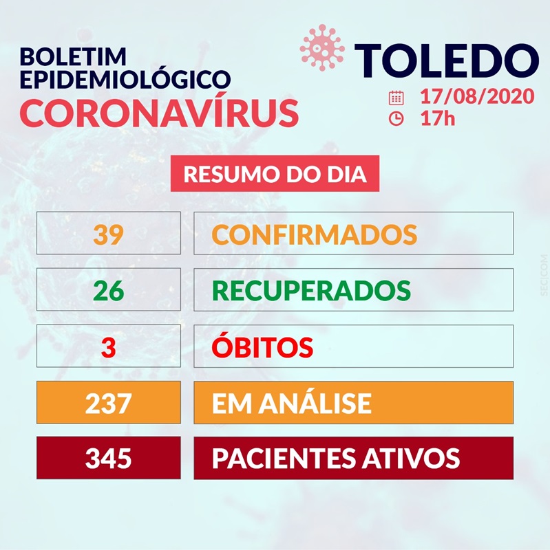 Nesta segunda-feira, 17/08, tivemos a confirmação de 39 novos casos da COVID-19, em Toledo.