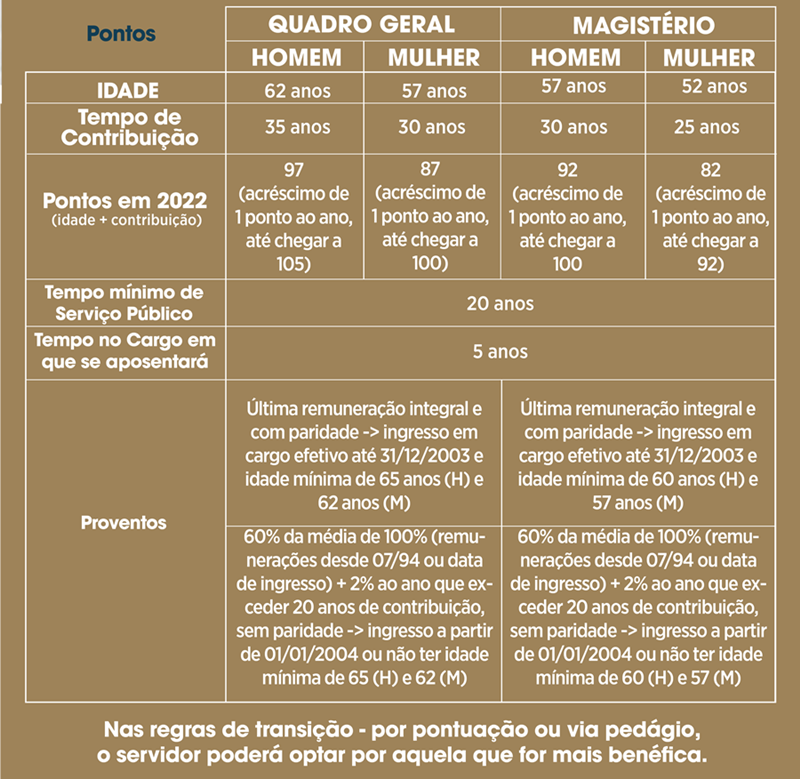 Estas regras consideram a data de ingresso, o gênero, o cargo que ocupa (quadro geral ou professor). Também haverá novos parâmetros sobre cálculo do benefício e reajustes, conforme será detalhado a seguir: