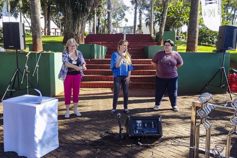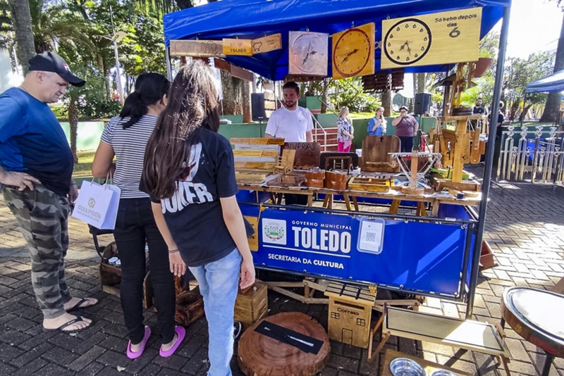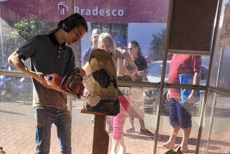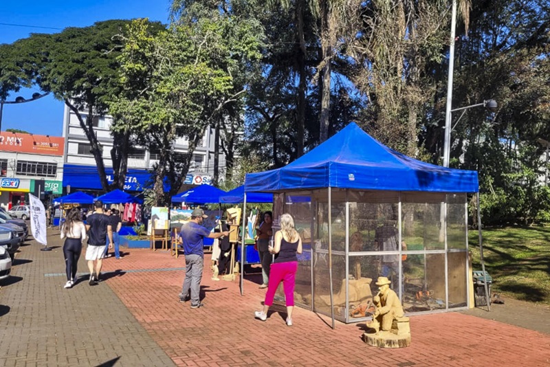 Mais atrações – Após a entrega das tendas, a Feira de Arte e Artesanato seguiu com várias atrações para todos os públicos, entre elas a produção de esculturas em madeira feitas pelo artesão do distrito de Dez de Maio, Elvis Ribeiro, e que foram sorteadas entre os munícipes que visitaram a Feira. Ela entalhou uma tartaruga utilizando motosserras. Além disso, o Duo Rodacústica cantou e encantou os presentes e a professora de teatro Lysiane Baldo realizou a intervenção poética “Pingos de Poesia”. O Projeto Tenda é coordenado pela assistente em desenvolvimento social da Secretaria da Cultura, Cleonice Dumke.