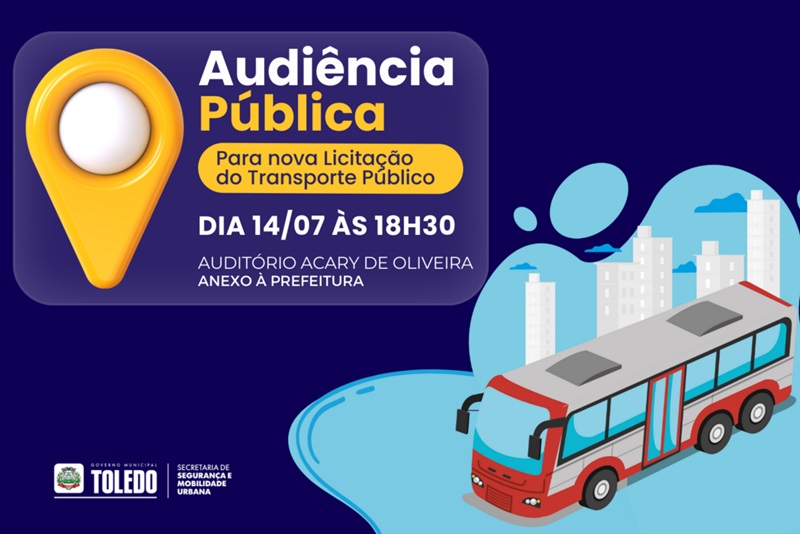 A população de Toledo está convidada a participar da audiência pública em que poderá conhecer melhor e opinar a respeito da concorrência pública da concessão do transporte coletivo urbano de passageiros. O evento será realizado nesta sexta-feira (14), às 18h30, no Auditório Acary Oliveira, anexo ao Paço Alcides Donin e será transmitido pelas redes sociais do governo municipal.