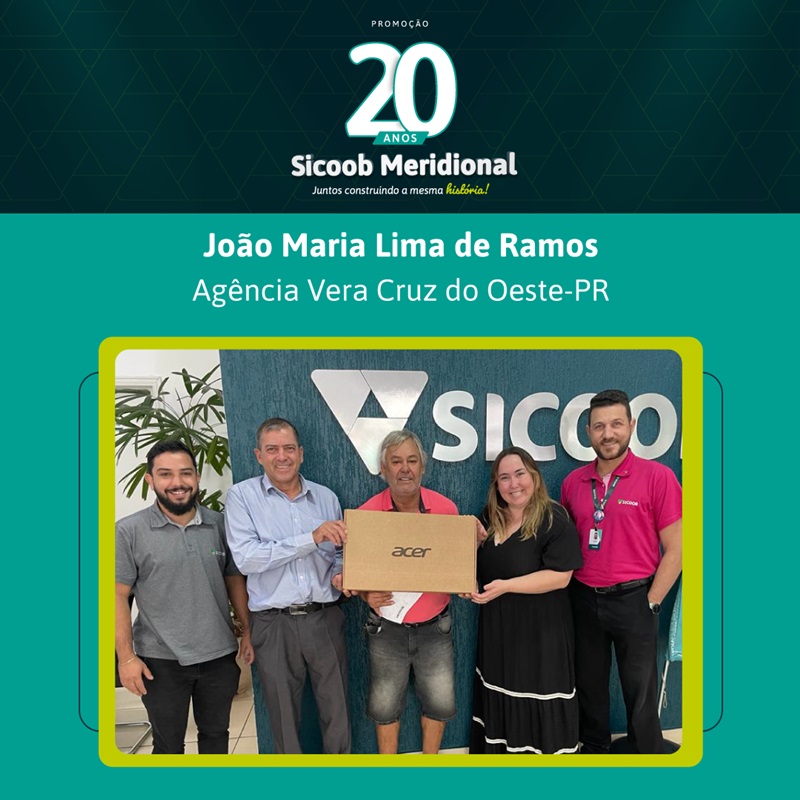 A campanha ‘20 anos Sicoob Meridional’ segue até o mês de dezembro e vai entregar mais de R$ 800 mil em prêmios, entre eles 50 vales-poupança no valor de R$ 5 mil cada, 20 televisores, 20 iPhones 13, 10 notebooks, 10 motos Honda Biz 0km e dois automóveis Fiat Toro 0km.