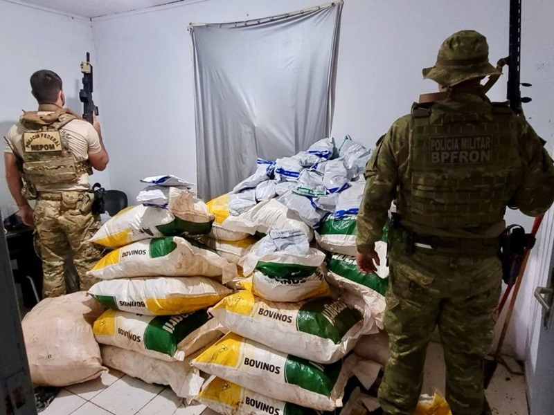 Em patrulhamento pelo município, os policiais realizaram uma vistoria em uma residência e apreenderam aproximadamente 842 kg de agrotóxicos de origem estrangeira, avaliados em R$ 1.050.000,00.