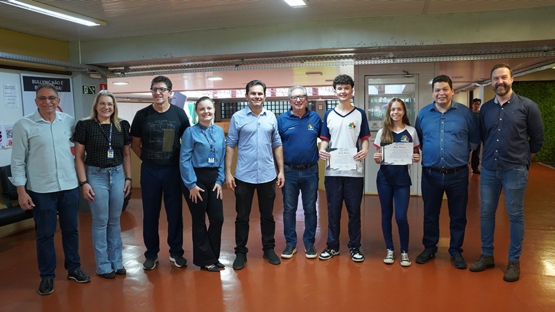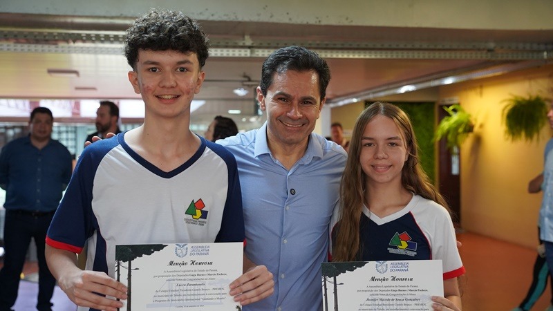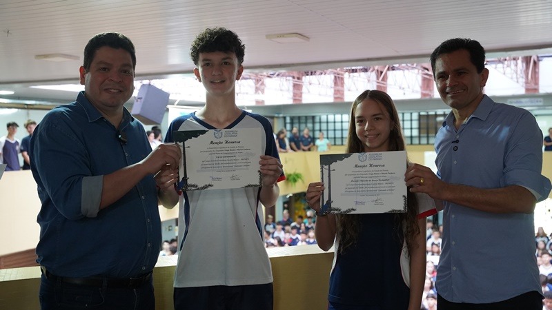 Durante o evento, os parlamentares também fizeram a entrega de Menções Honrosas aos alunos selecionados para o programa de intercâmbio internacional Ganhando o Mundo, Jhenifer Macedo de Souza Gonçalves e Lucca Zarantonelo.