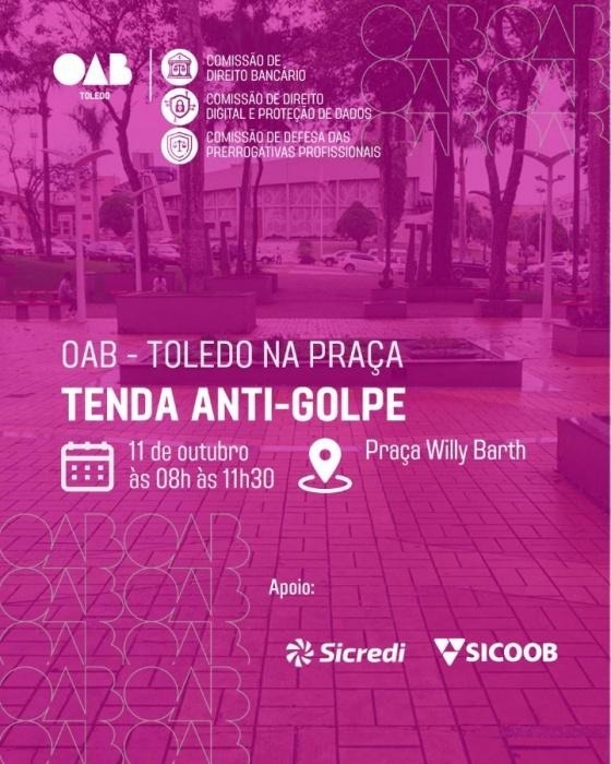 A Ordem dos Advogados do Brasil (OAB – Paraná), Subseção Toledo, promove neste sábado (11), uma ação voltada à conscientização da população sobre golpes e fraudes bancárias. A iniciativa ocorrerá na Praça Willy Barth, das 08h30 às 11h30, e contará com apoio da Sicredi, Sicoob e Polícia Civil (PC).