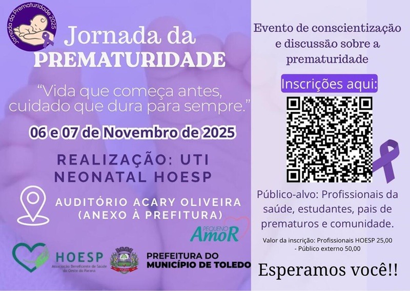 Durante os dias 6 e 7 de novembro acontecerá a 1º Jornada da Prematuridade no Auditório Acary Oliveira, anexo ao Paço Municipal Alcides Donin. O evento tem como propósito principal promover a conscientização sobre a prematuridade na gestação, envolvendo profissionais de saúde, estudantes da área, pais de prematuros e a comunidade em geral. O evento é uma realização da UTI Neonatal da Associação Beneficente de Saúde do Oeste do Paraná (HOESP) com o apoio da Prefeitura Municipal de Toledo.