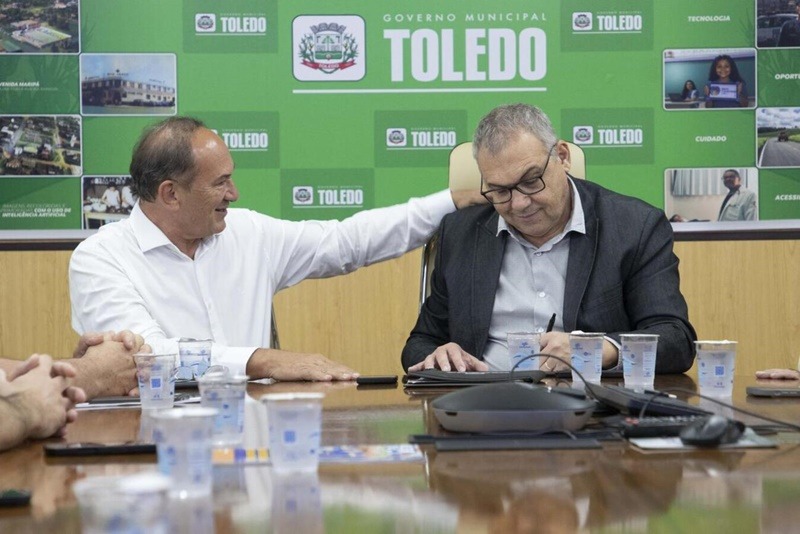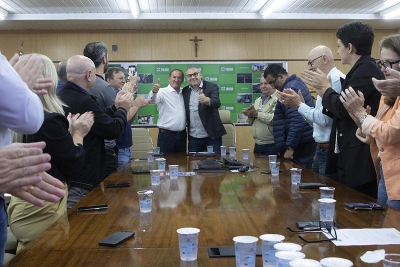 Foi realizada nesta terça-feira (18) a solenidade de transmissão do cargo de prefeito de Toledo, do vice-prefeito Lucio De Marchi para o titular Mario César Costenaro, após período de licença autorizado pela Resolução nº 140/2025 da Câmara Municipal. Desde 6 de novembro, Lucio De Marchi havia assumido a chefia do Executivo durante a viagem oficial de Costenaro à Alemanha e à Finlândia, organizada pela Associação dos Municípios do Oeste do Paraná (Amop), pelo Programa Oeste em Desenvolvimento (POD) e pelo Sebrae-PR.