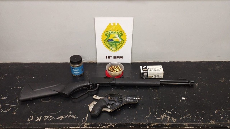 Diante da desobediência, do estado de agitação e da tentativa de fuga, foi necessário contê-lo e fazer uso de algemas. A mãe do autor acompanhou a ação policial. A arma de fogo mencionada pela vítima não foi localizada.
