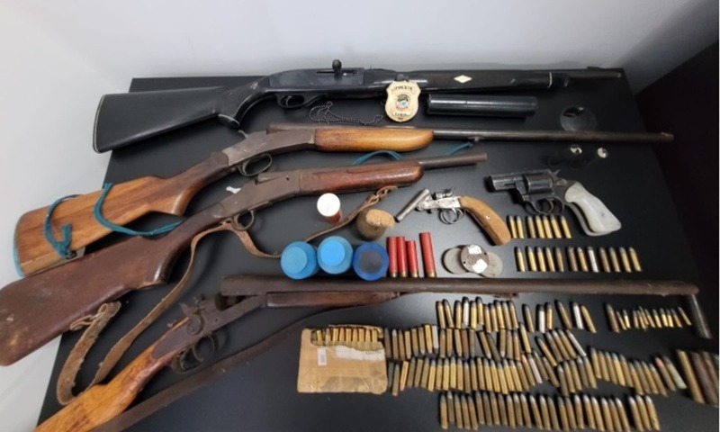 Foram apreendidas três espingardas calibre 12, uma carabina calibre 357 Magnum, uma carabina calibre 22 e um revólver calibre 357 Magnum.