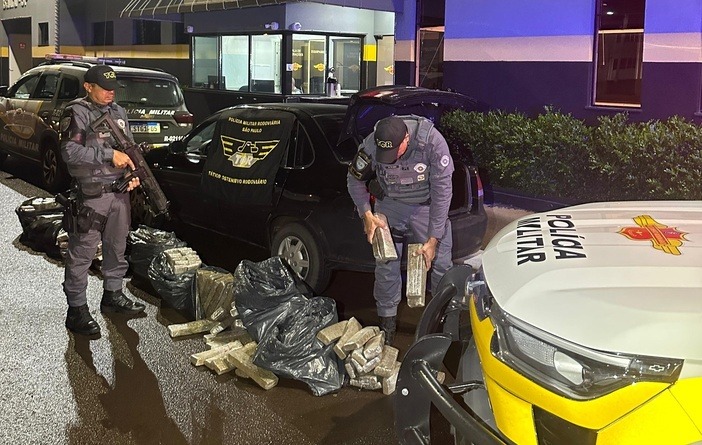 Durante a vistoria, os agentes localizaram diversos tabletes de maconha no automóvel.