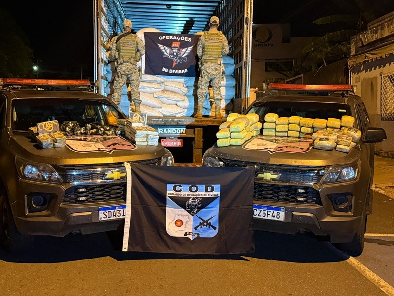 No entanto, diante de inconsistências nas informações, os policiais realizaram uma vistoria detalhada e localizaram diversos fardos de drogas escondidos sob a carga lícita.