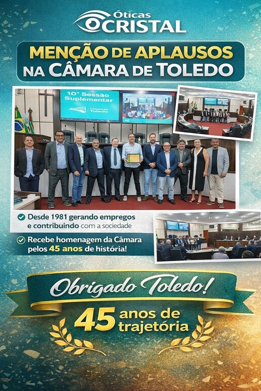 A Óticas Cristal, fundada em 23 de abril de 1981, foi homenageada pela Câmara de Vereadores de Toledo com uma menção de aplausos, aprovada por unanimidade pelos parlamentares.