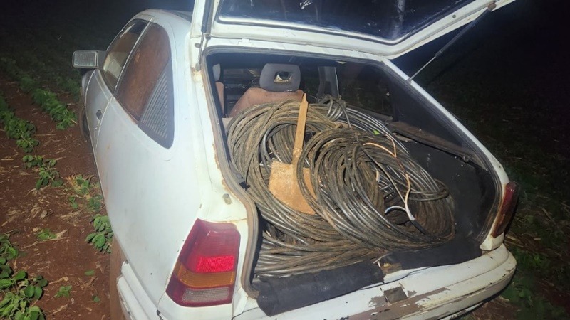 O carro foi acompanhado por cerca de 7 km até ser abandonado pelos ocupantes em uma área de plantação, que fugiram para a mata. No porta-malas, a polícia encontrou fios elétricos e ferramentas possivelmente usados em furtos.